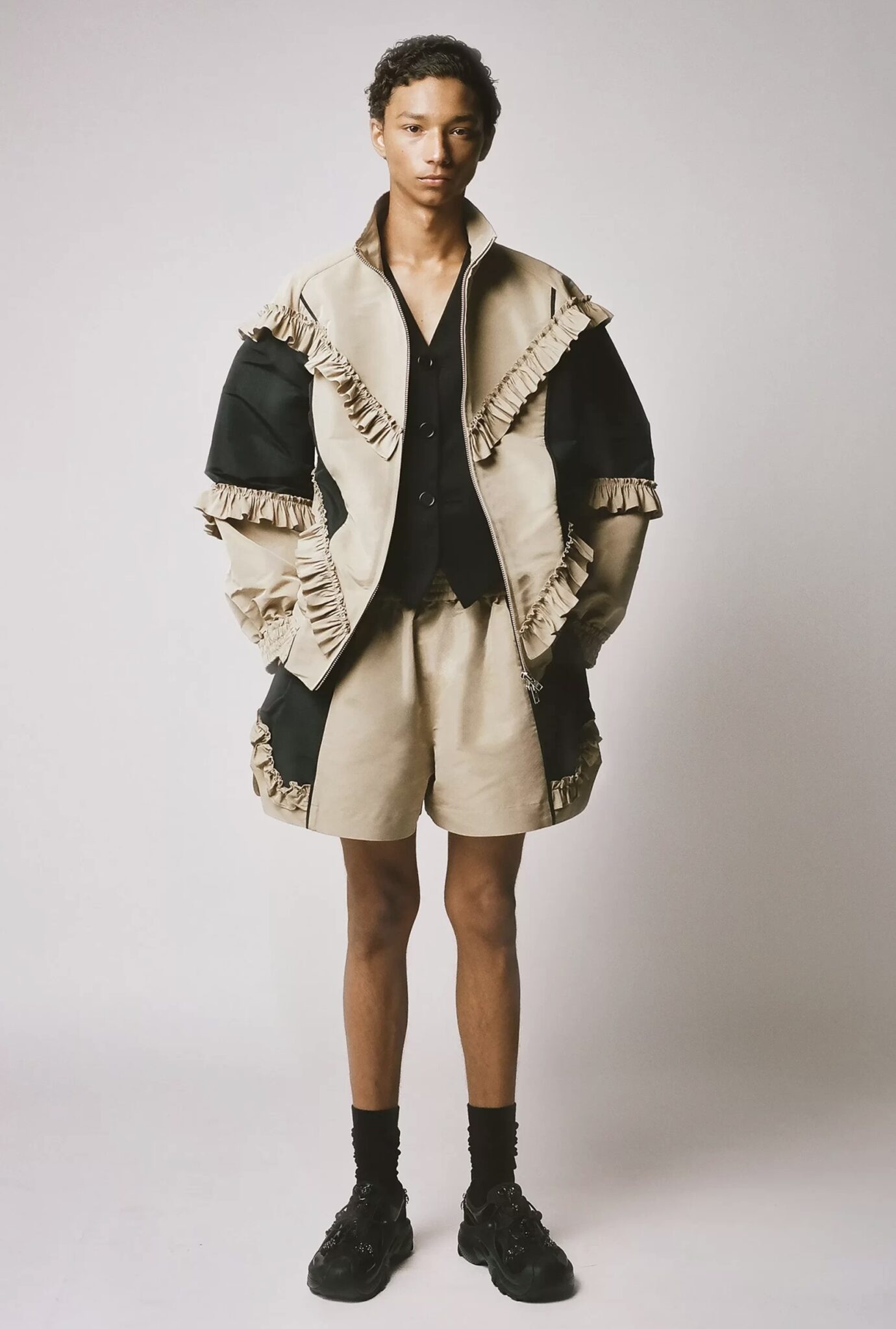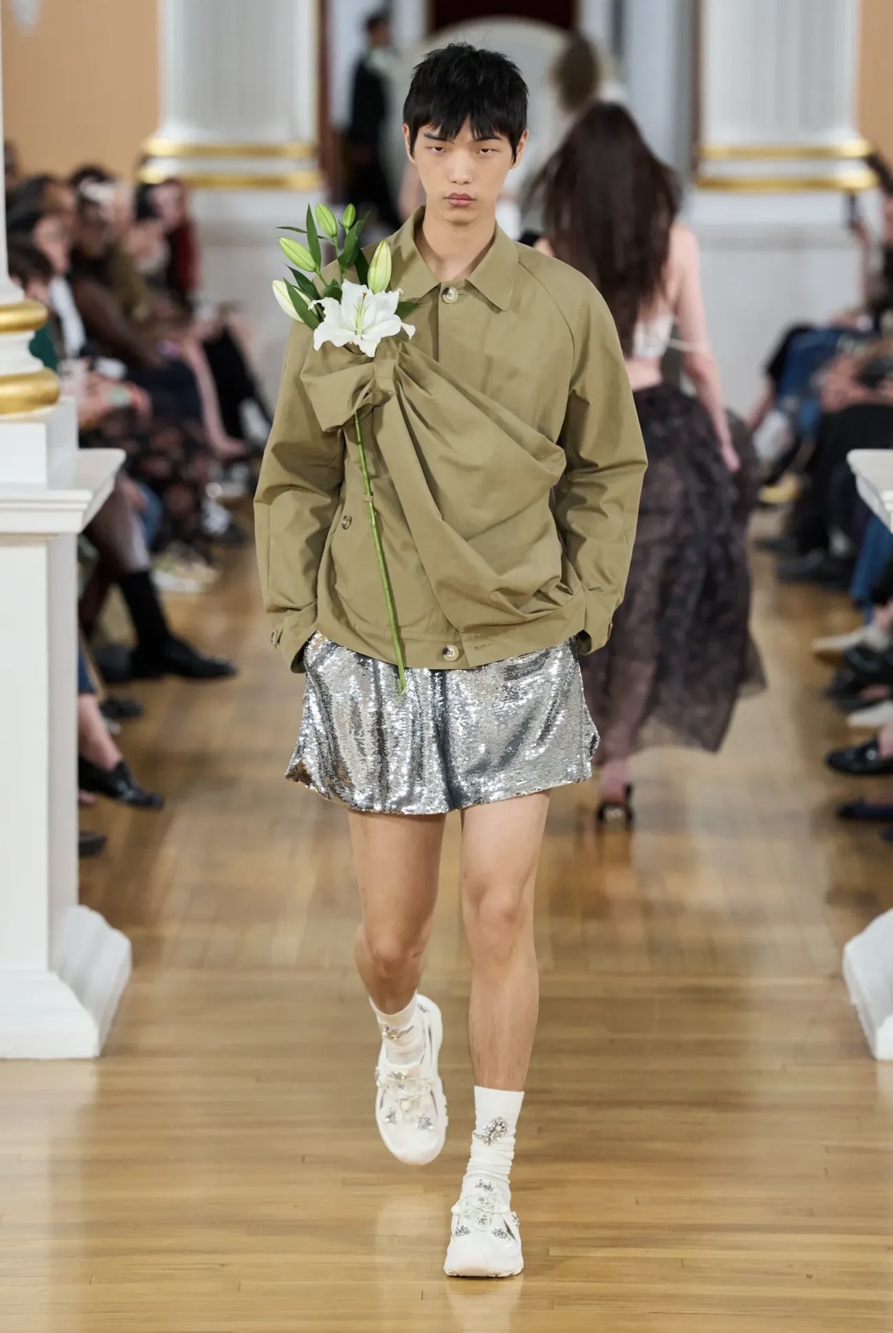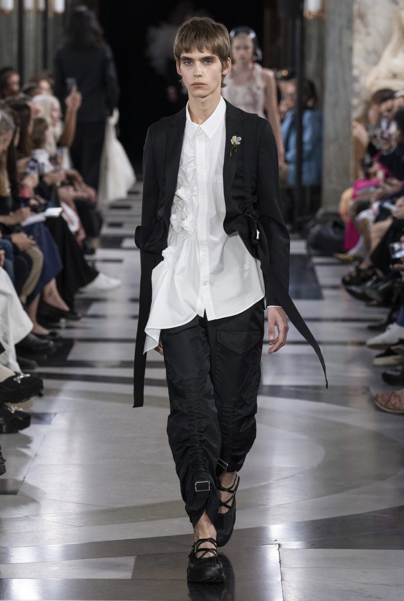Questo debutto in solitaria non solo consolida l’evoluzione della sua linea uomo, introdotta nel 2022, ma evidenzia anche una scelta strategica: dare piena autonomia a un linguaggio creativo che finora conviveva con le sue collezioni femminili. In questa nuova fase, Rocha mette al centro una narrazione propria per il menswear, in cui i suoi codici — romanticismo, fragilità e struttura — si sviluppano senza interferenze né divisioni in passerella.