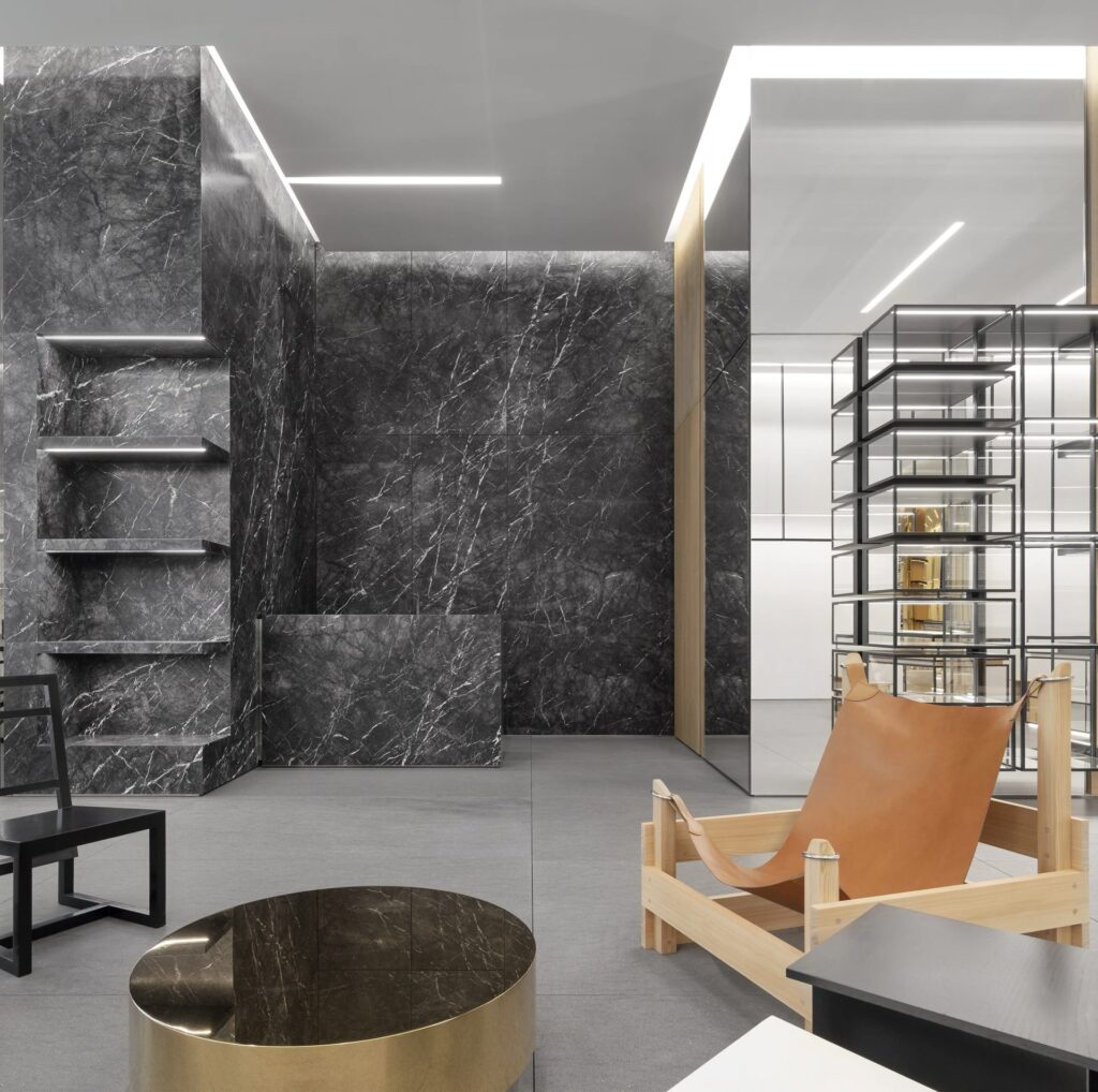 Le boutique di Celine in Cina stupiscono con il loro stile moderno: pavimenti in marmo e colonne rivestite alternativamente di marmo, pietra, lastre a specchio o ottone lucido. Una gamma accuratamente selezionata di sedie, tavoli e lampade articola ulteriormente la visione altamente distintiva del retail di Hedi Slimane.