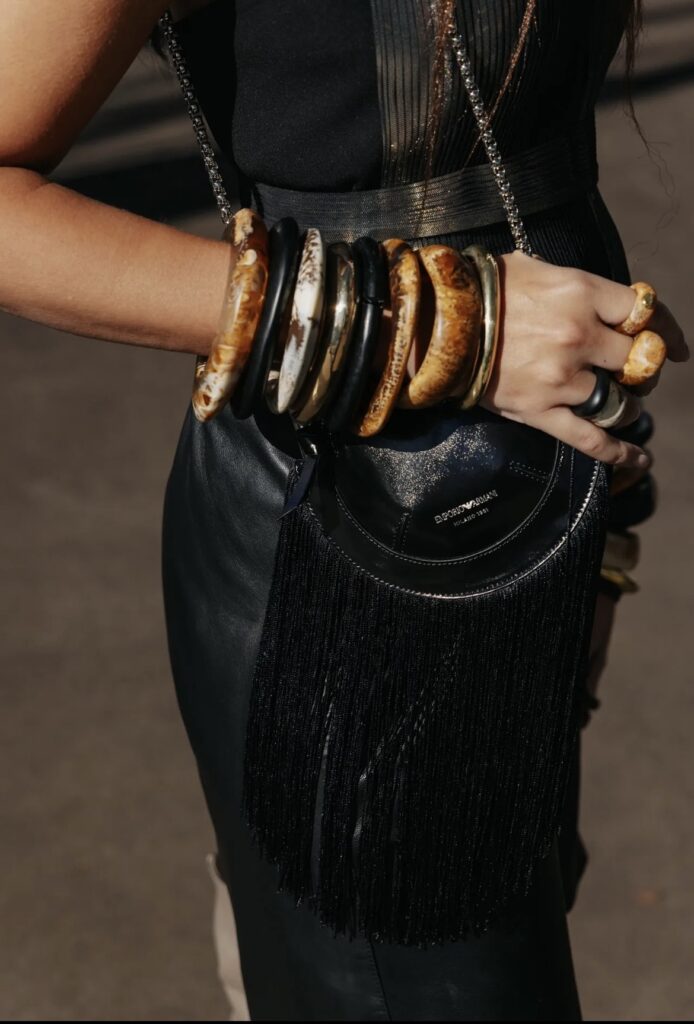 Questa estetica del “too much” trova un alleato inaspettato nello stile boho chic, un’altra tendenza che ritorna con forza e condivide la stessa voglia di colpire senza sforzo. Designer come Isabel Marant fondono i due mondi con maestria: bluse impalpabili accostate a gioielli rigidi, bracciali imponenti e orecchini oversize. Protagoniste assolute sono le bracciali maxi portate sopra le maniche: versatili, potenti e visivamente audaci, sono perfette tanto in estate quanto in inverno. Dalle strade alle passerelle, questa estetica si impone come una delle più iconiche della stagione.