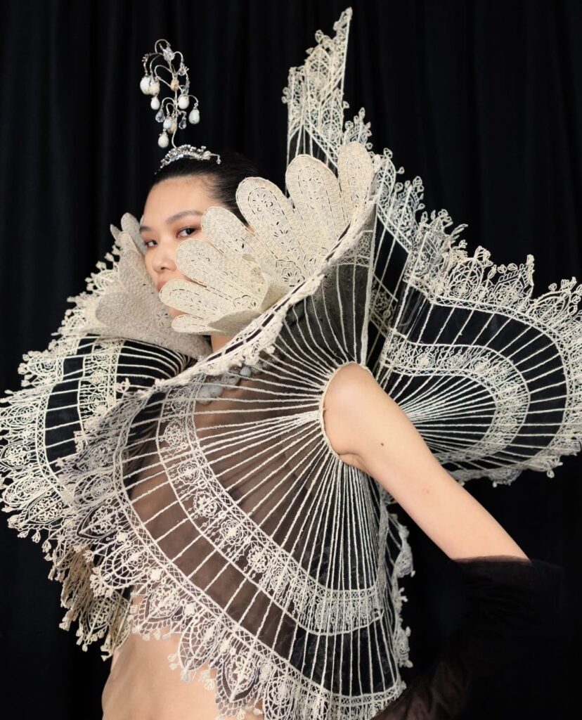 Ispirata all’universo degli uccelli e di altre creature, la collezione gioca con movimenti e forme che mettono in discussione le proporzioni tradizionali dell’abito. I volumi audaci e le cromie intense non cercano soltanto l’impatto visivo, ma costruiscono una narrazione estetica in cui ogni pezzo possiede una propria identità. In questo contesto, l’eccesso diventa uno strumento per esplorare tensioni costanti: tra organico e architettonico, leggerezza e struttura, emotività e razionalità. La collezione instaura un dialogo tra la delicatezza del piumaggio e la fragilità apparente del volo, così come tra la solidità delle costruzioni sartoriali, dalla corsetteria ai ricami di estrema precisione.