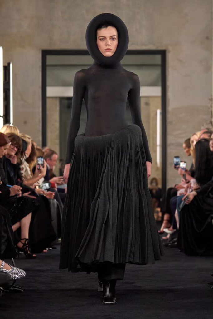 Le creazioni hanno giocato con volumi e strutture audaci, pur mantenendo la sensualità iconica di Alaïa. Spiccano le spalle importanti, modellate come anemoni di mare, le cappe avvolgenti e gli abiti con tagli che sembravano galleggiare sulla pelle. Un abito in jersey è stato impreziosito da tubi metallici, che seguivano e scolpivano ogni curva del corpo, mentre le pieghe asimmetriche e le aperture sulla schiena aggiungevano movimento e fluidità.