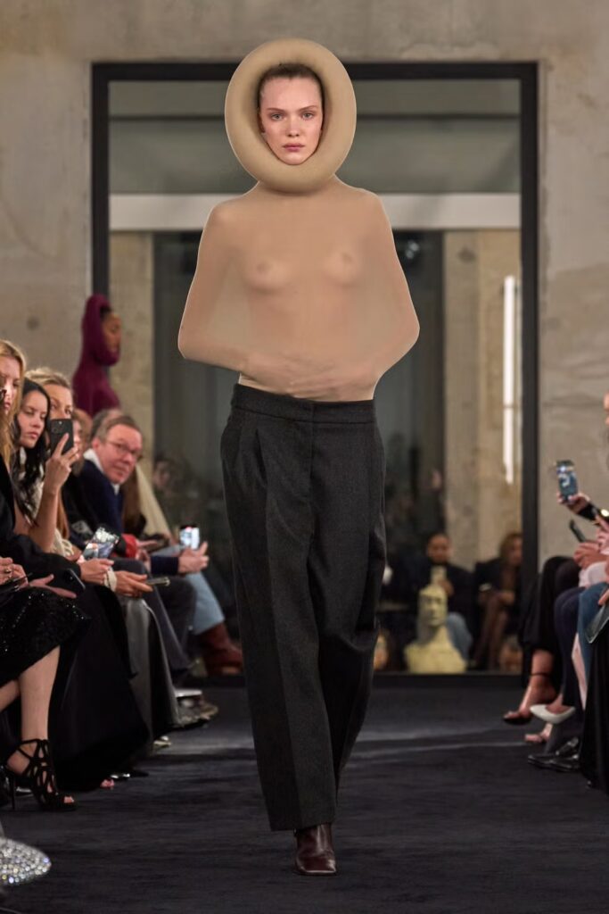 Nonostante il forte impatto artistico, la collezione ha incluso anche capi pratici come cappotti a vestaglia e giacche imbottite, dimostrando un perfetto equilibrio tra avanguardia e funzionalità. Persino le calzature, con design asimmetrici, si inserivano in questa visione di moda senza regole rigide. Con questa proposta, Mulier ha riaffermato la sua visione per Alaïa: creazioni che combinano scultura e movimento, mantenendo l’artigianalità e la sensualità della maison, ma con un approccio moderno e audace.
