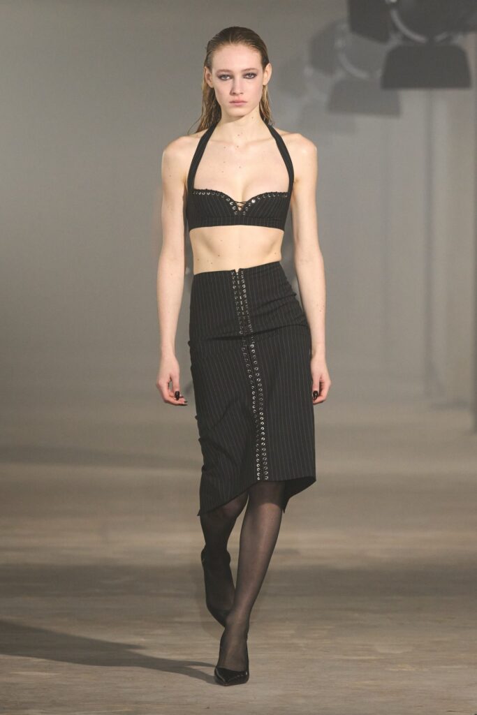 Intitolata L’Entretien (Il Colloquio), la collezione esplora l’intersezione tra il mondo corporate e l’estetica della notte. “È come quando esci dal club, ma senti ancora la musica mentre ti dirigi verso un incontro che può cambiarti la vita”, ha spiegato Saint Sernin. L’idea che una donna possa muoversi tra questi due universi senza perdere la propria essenza è il cuore pulsante della proposta: una sensualità strategica che non cerca di compiacere lo sguardo maschile, ma afferma un’identità forte e autonoma.