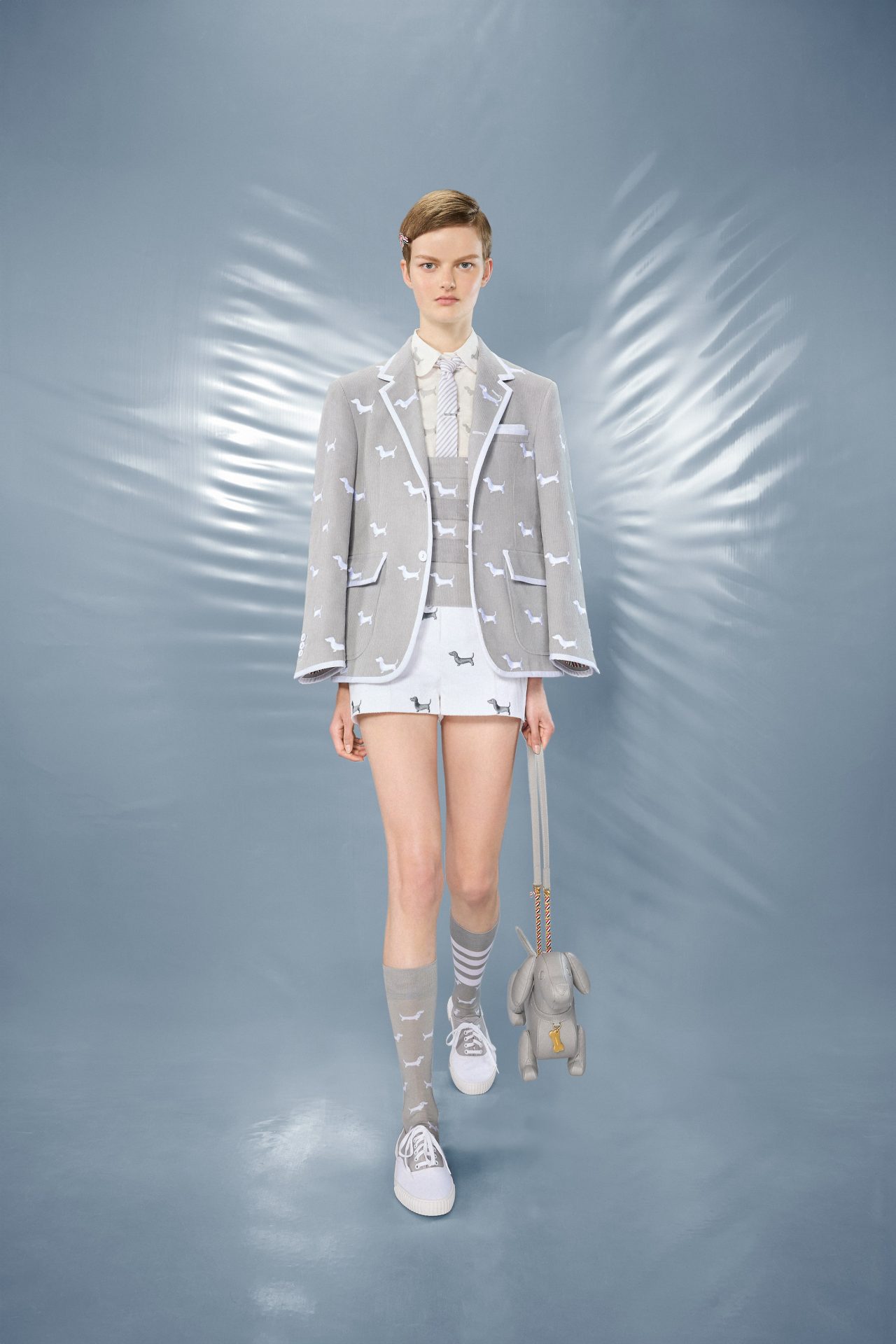 La collezione celebra non solo la creatività, ma anche l’inclusività. Le linee maschili e femminili si intrecciano, abbattendo le barriere di genere con proposte come gilet in tweed, camicie a strati e completi con cravatta. La palette di colori gioca con il rosso, bianco e blu, ma include anche tonalità più classiche come bianco e nero, ideali per chi cerca versatilità. Ogni design sembra pensato per adattarsi a diversi stili di vita, dal più casual al più formale, senza mai perdere l’ADN del marchio. E non dimentichiamoci degli inconfondibili motivi decorativi: silhouette di cani trasformate in stampe che, incredibilmente, funzionano perfettamente.