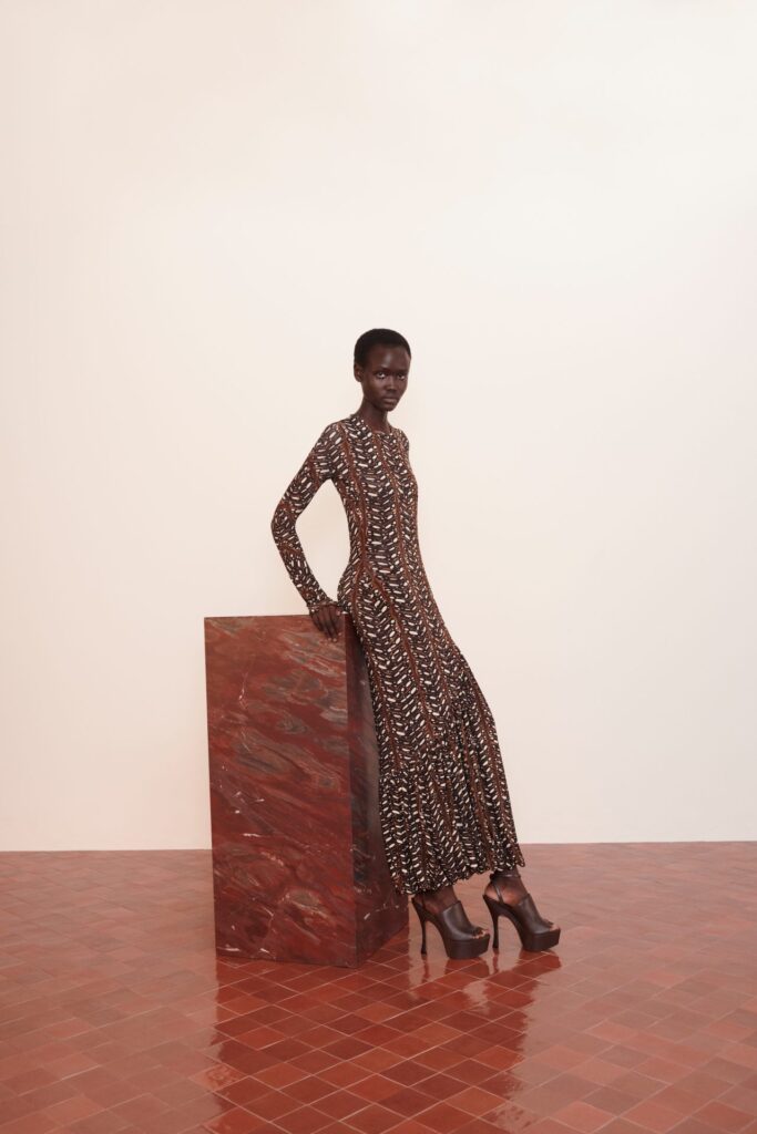 La celebre borsa intrecciata raggiunge nuove vette grazie a intricati intrecci di Gancini in pelle che avvolgono una borsa interna in tela con chiusura a coulisse. Parallelamente, il glamour degli anni ’70 viene reinterpretato con una facilità contemporanea: “Quel modo di vestire era così elegante, ma al tempo stesso così libero”, sottolinea Davis. La sensualità nonchalant del scarf dressing si traduce in mini abiti di satin lucido o foulard cuciti per creare gonne e camicie, mentre lunghi abiti in cady con scolli profondi appaiono fluidi e gloriosi.