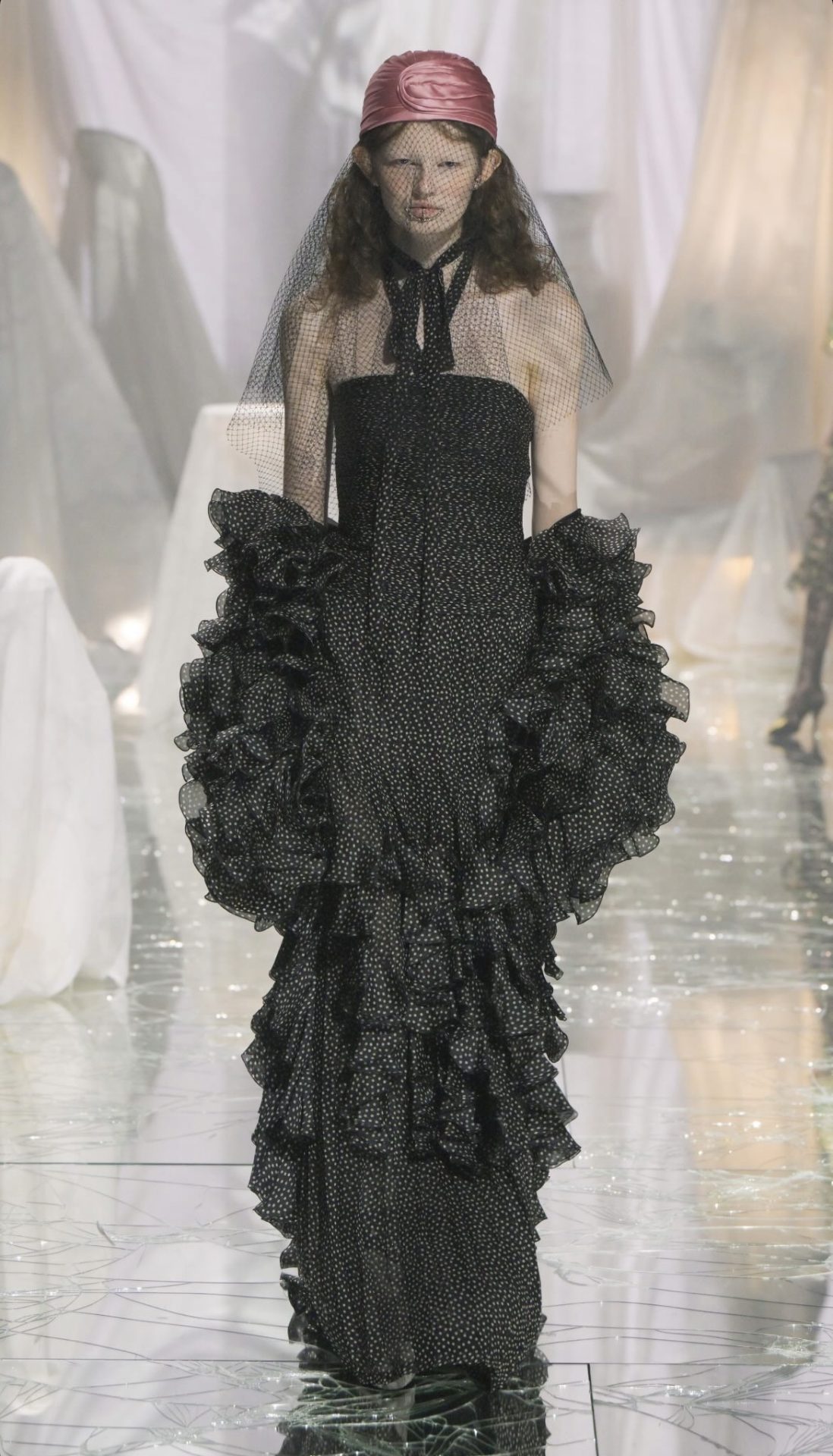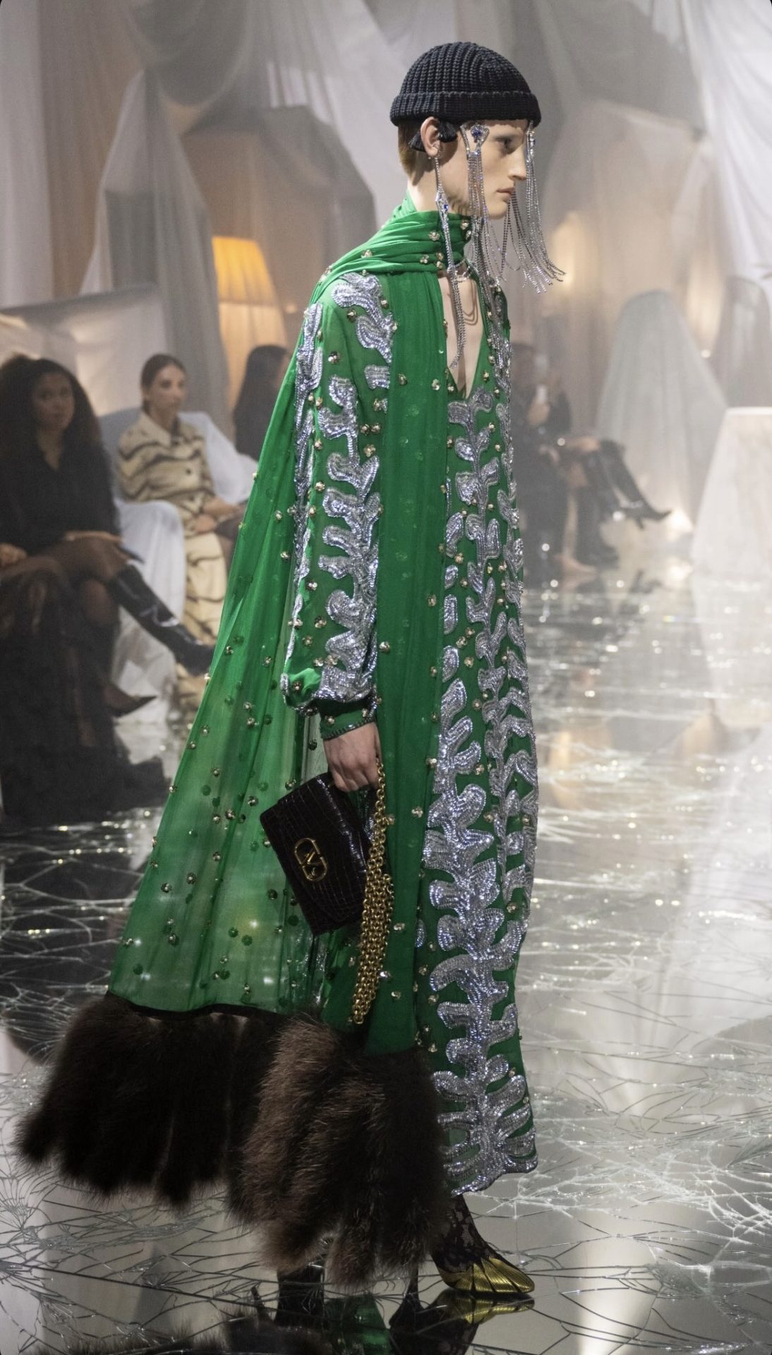 Per quanto riguarda gli accessori, il massimalismo ha dominato la scena: papillon XXL, cappelli sontuosi adornati con piume, fiocchi stravaganti, piercing e veli gotici che coprivano i volti delle modelle. La palette cromatica, composta da toni attenuati e abbondante bianco, ha conferito un’aria serena alla collezione. Senza dubbio, un’ode al contemporaneo e alla bellezza nella sua forma più eterea. L’evento ha visto la partecipazione di numerose celebrità vicine a Michele, venute ad ammirare il suo atteso debutto: Jared Leto e Harry Styles, fedeli seguaci e amici del designer, gli attori Salma Hayek e Andrew Garfield, e i cantanti Elton John e Carla Bruni, tra gli altri.