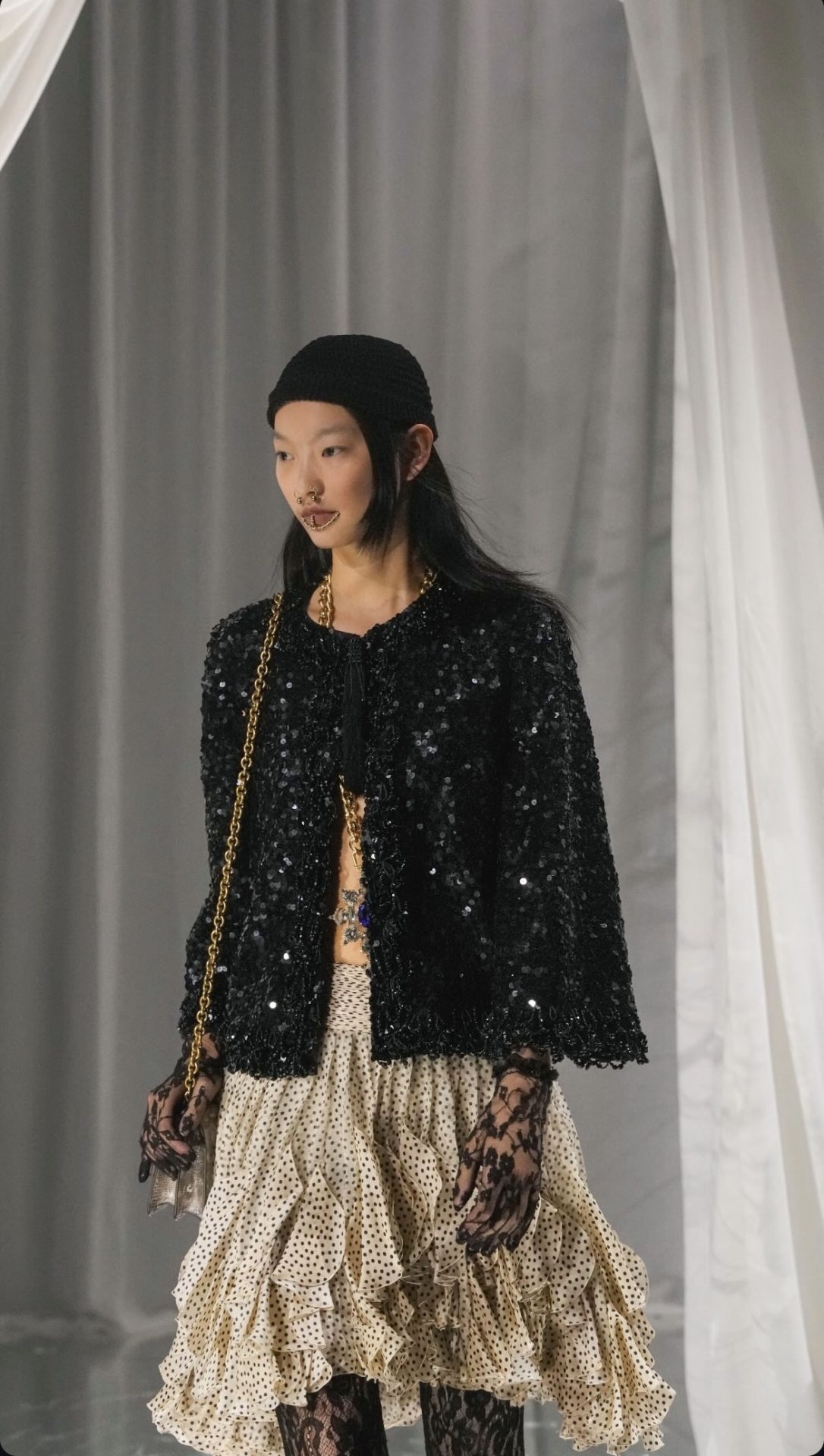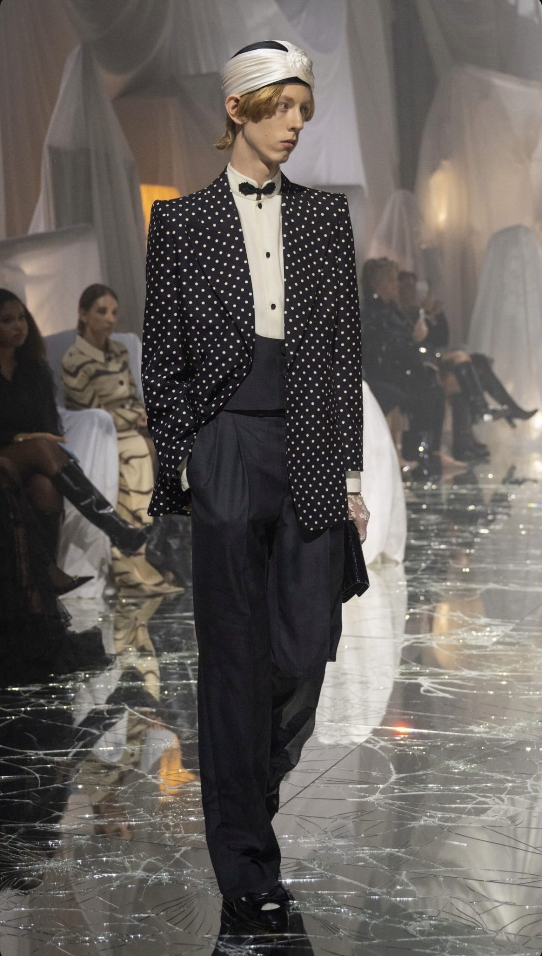 Con il debutto della collezione Resort, che conta 171 pezzi, ieri sono stati presentati 85 di questi affascinanti look in passerella. L’atmosfera era misteriosa, strana e bella allo stesso tempo: mobili coperti da lenzuola semitrasparenti, modelle che camminavano su un pavimento di vetro incrinato e, in sottofondo, una melodia ipnotica che si ripeteva senza sosta mentre una voce in varie lingue sussurrava: “la vita è un sogno”. Sotto il nome *Pavillon des Folies* (Il padiglione delle follie), la collezione ha proposto abiti adornati con archi, capi di paillettes e stole di pelliccia, giacche da smoking, abiti con infiniti volant e mantelli, calze di pizzo e pezzi ricamati con cristalli.