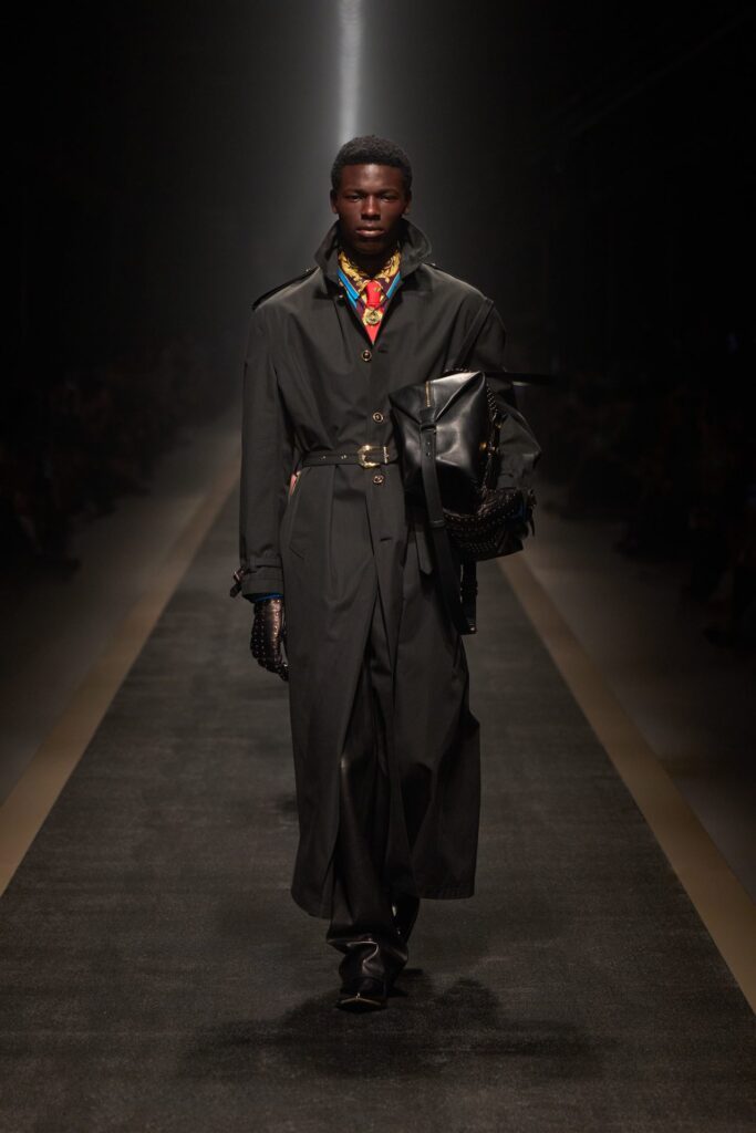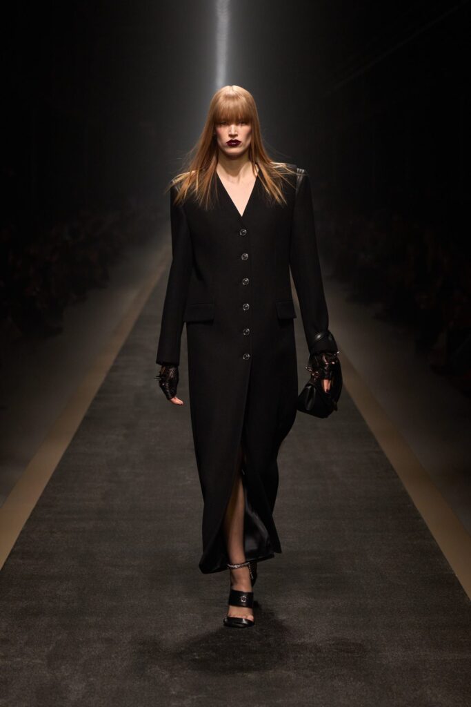 Per quanto riguarda lo styling, Pat McGrath ha creato un beauty look audace, caratterizzato da labbra color borgogna intenso, ispirandosi alla modella iconica Kristen McMenamy. Gli accessori hanno giocato con il contrasto tra forza e raffinatezza: guanti e cappellini borchiati hanno aggiunto un tocco punk, mentre la nuova borsa Virtus, con la sua forma semicircolare e la maniglia strutturata, ha dimostrato un’evoluzione verso un’eleganza più sofisticata.