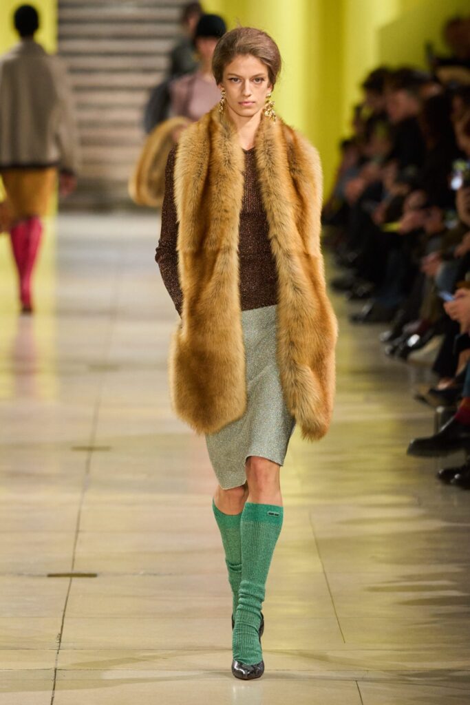 La passerella è stata un viaggio visivo in cui silhouette strutturate si sono mescolate a dettagli morbidi e fluidi. Gonne sottoveste in raso, reggiseni conici e stole in eco-pelliccia convivevano con blazer oversize e gonne tagliate in sbieco, creando un equilibrio tra ribellione e romanticismo. Miuccia Prada ha giocato con l’idea di femminilità attraverso capi che accarezzano il corpo senza costringerlo, utilizzando curve e drappeggi che trasmettono libertà e movimento. I colori, dai classici grigio, marrone, beige e nero — simboli di eleganza — fino agli arancioni, viola, verdi, gialli e fucsia più vivaci, hanno rafforzato l’idea di una donna che non ha paura di essere sfaccettata. Una proposta che dimostra che anche l’inverno può essere audace, vibrante e per tutti i gusti.