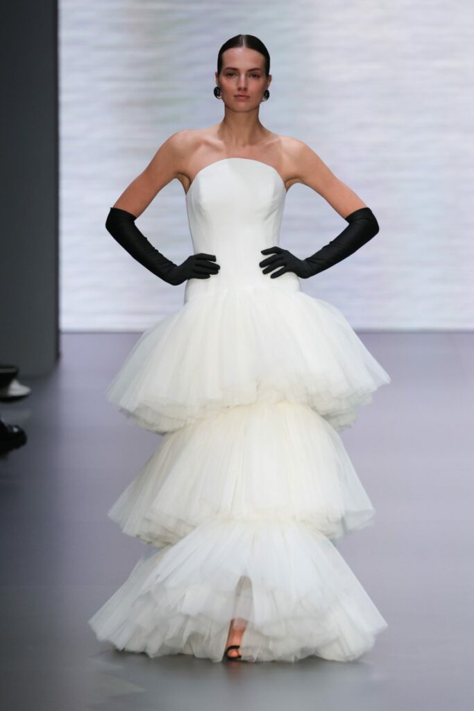 La vita bassa, uno stile ispirato agli anni ’20, sarà una delle silhouette più ricercate della stagione. Questo taglio allunga il corpo e dà l’illusione di un busto più slanciato, ideale per le spose con un gusto vintage. Marchi come Lein e Ines Di Santo hanno presentato abiti con vita bassa senza spalline, mentre Reem Acra e Cinq hanno sperimentato con tulle e cinture per offrire una combinazione di classico e moderno.