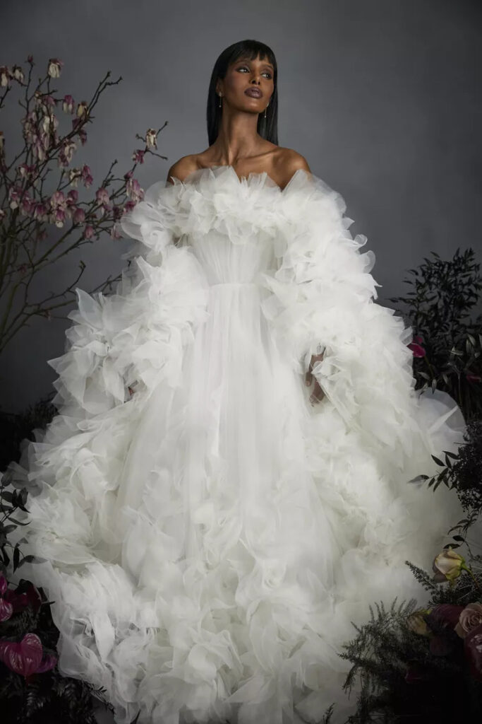 Il tulle continua a essere un favorito nel mondo della moda nuziale. Se hai sempre sognato un abito avvolgente in questo materiale, sei fortunata. Giambattista Valli e Marchesa hanno dimostrato che il tulle è perfetto per creare volumi drammatici che conferiscono una silhouette maestosa e morbida, ideale per farti sentire una vera regina nel giorno del tuo matrimonio.